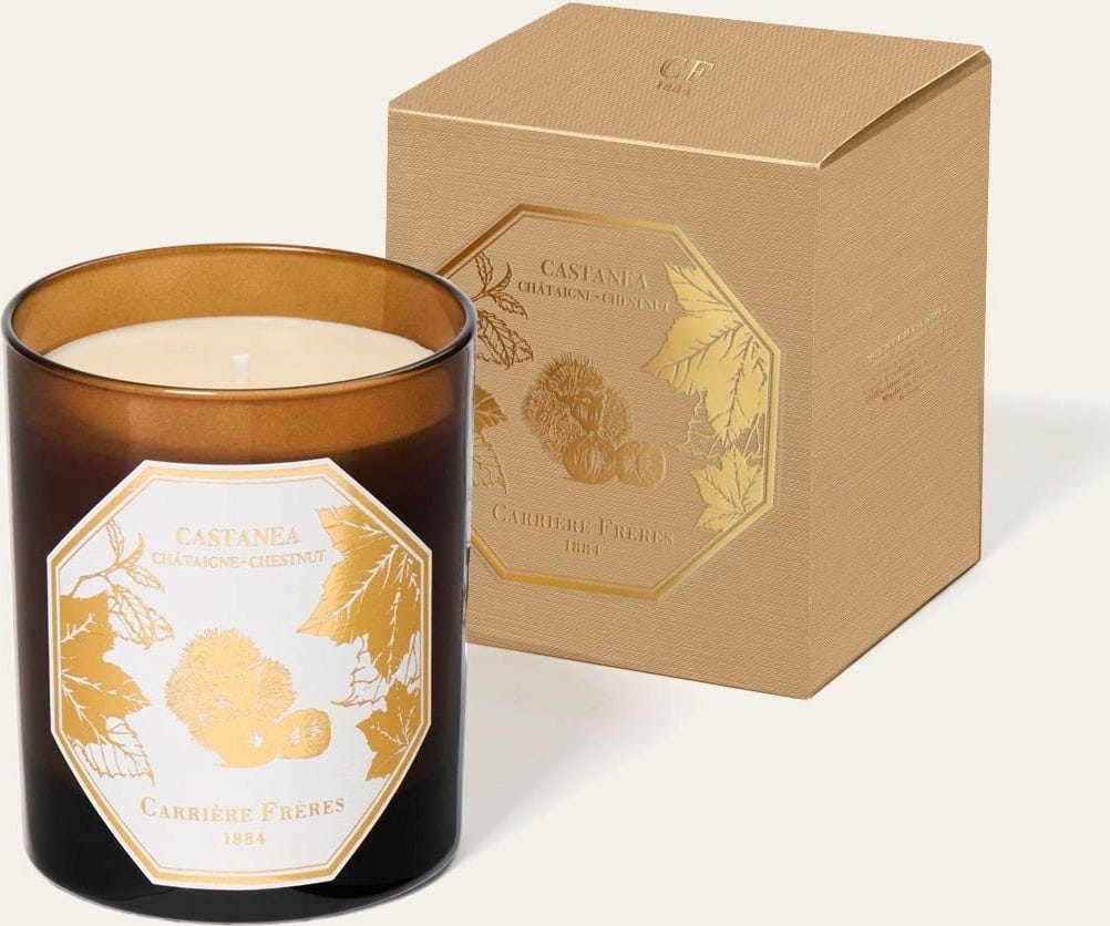 La Bougie Châtaigne de Carrière Frères enchante par ses notes rondes et chaleureuses, qui dégagent en même temps un certain apaisement et réconfort. L'arôme rond et enveloppant des châtaignes grillées se diffuse avec gourmandise, tandis que des accords fumés de bois de cèdre et de santal se mêlent à la douceur des fruits secs. La chaleur vanillée du benjoin du Siam complète parfaitement le parfum.