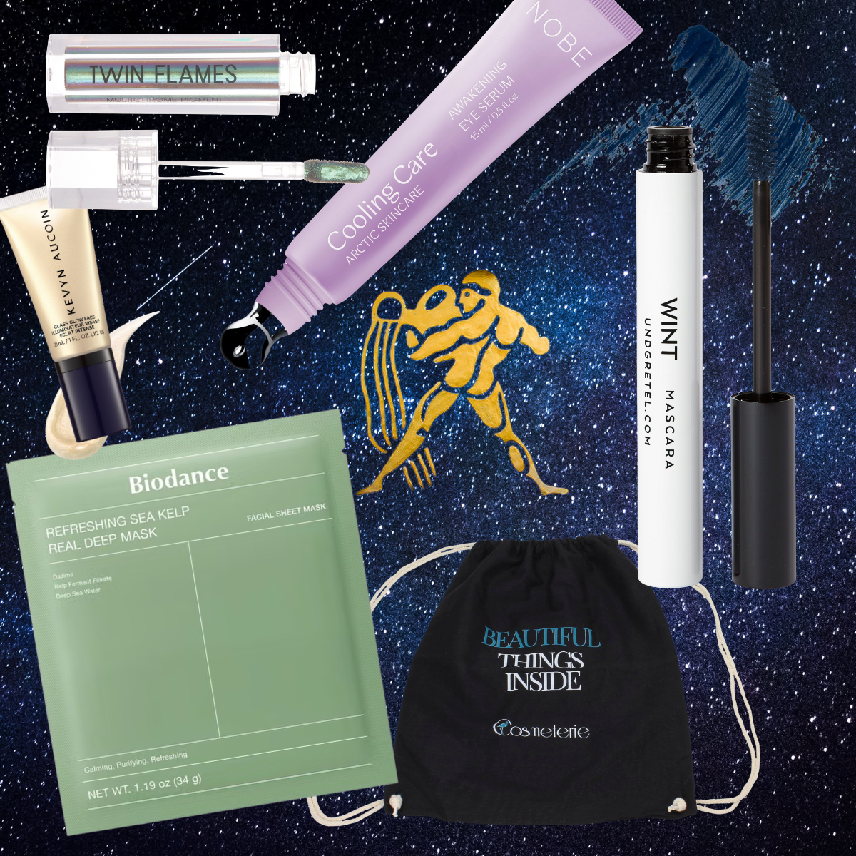 En parfaite harmonie avec la nature libre et créative du Verseau, ce Zodiac Beauty Set est idéalement conçu pour ce signe astrologique. Il comprend un Highlighter lumineux de Kevyn Aucoin, un Midnight Blue Mascara de UND GRETEL, un sérum contour des yeux rafraîchissant de NOBE Nordic Beauty, une touche de couleur audacieuse signée Danessa Myricks, ainsi qu’un masque visage nourrissant de Biodance. Le tout accompagné d’un sac Cosmeterie offert.