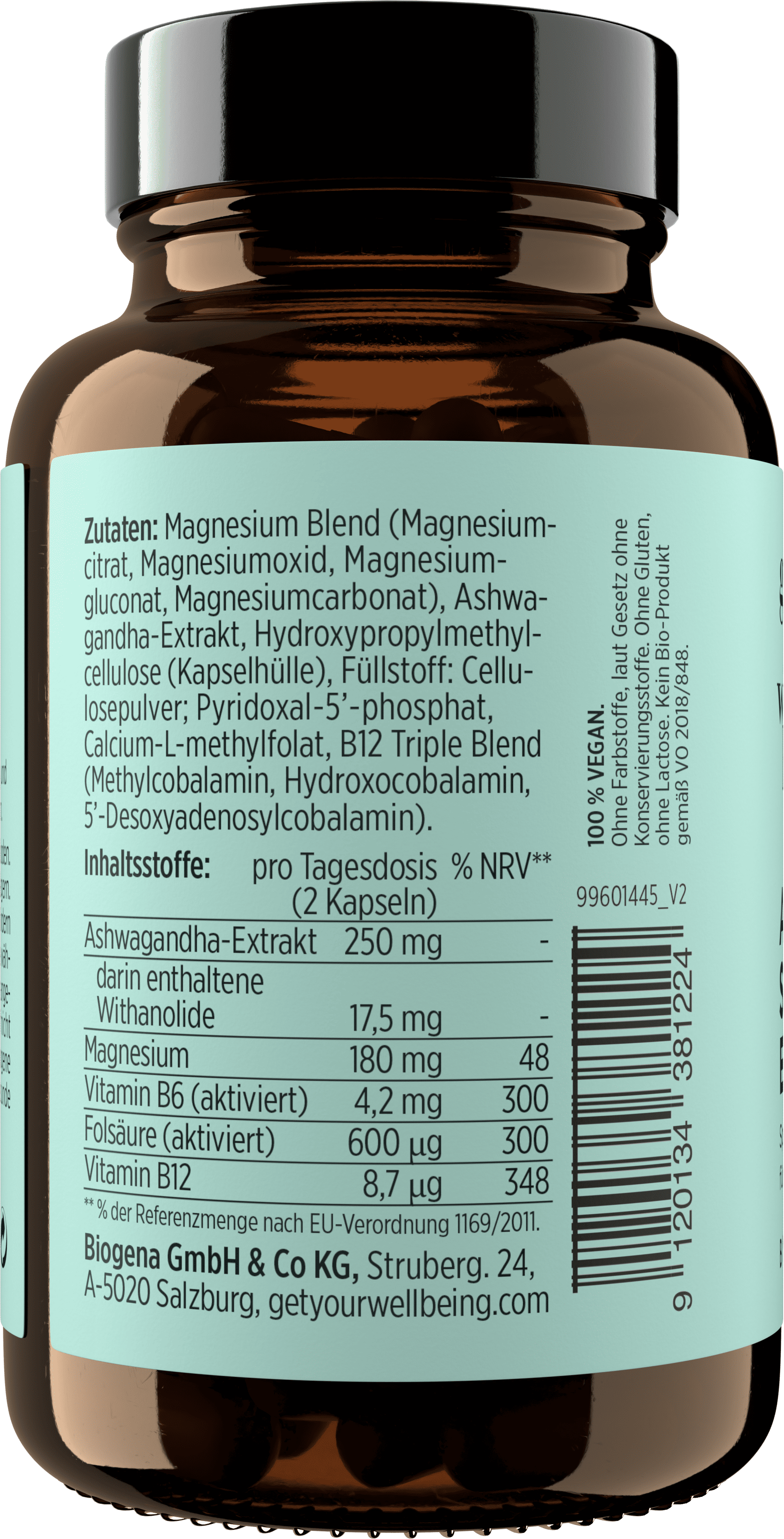 mélange de magnésium (Citrate de magnésium, Magnésium (sous forme d'oxyde) , Gluconate de magnésium, Magnesiumcarbonat), Ashwagandha, Hydroxypropylméthylcellulose (Kapselhülle), charge (Cellulose), Pyridoxal 5‘ Phosphat, Metafolin® (L-méthylfolate de calcium), Vitamine B12 (Méthylcobalamine, Vitamine B12 (hydroxocobalamine), 5'-Desoxyadenosylcobalamine)
