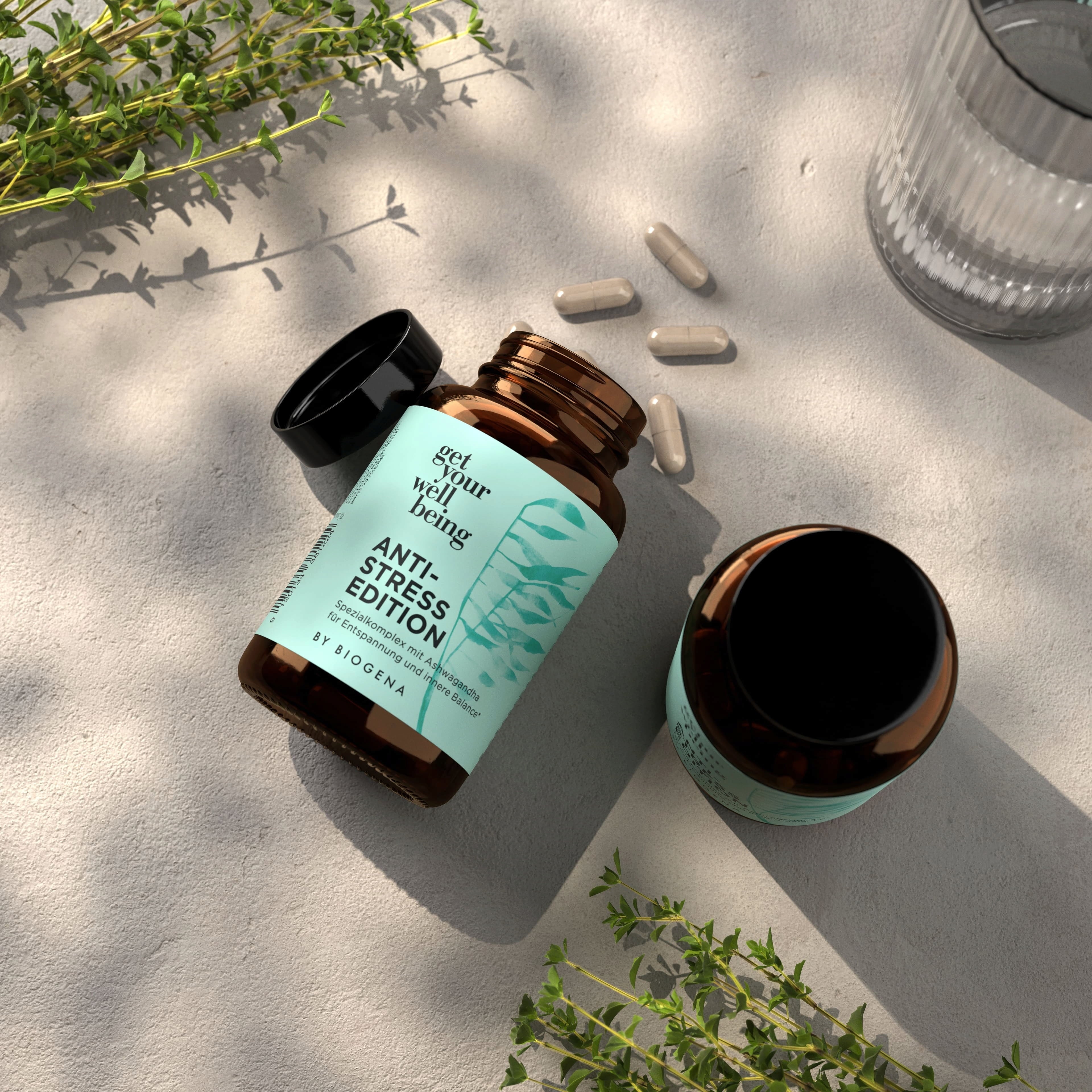 L'Anti Stress Edition de get your wellbeing by BIOGENA propose une combinaison ciblée de magnésium, de vitamines B (B6 activée, B12 en triple-blend et folate activé) ainsi qu'un extrait hautement dosé d'Ashwagandha. Cette formule soigneusement élaborée soutient l’équilibre mental et physique en période de stress accru, et favorise ainsi une sensation d’harmonie intérieure.