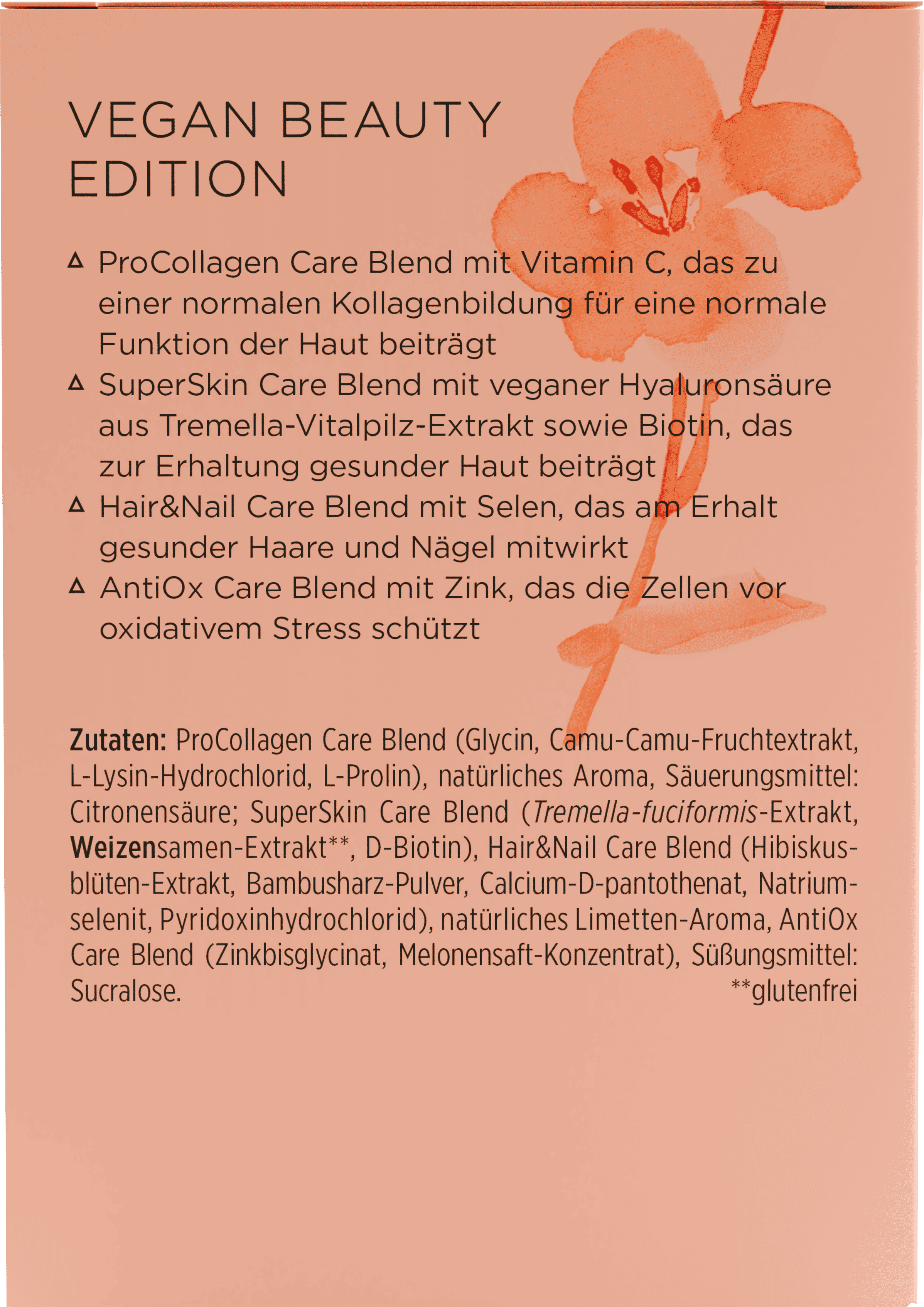 ProCollagen Care Blend (glycine, extrait de fruit de camu-camu, Chlorhydrate de L-lysine, L-proline), Arôme naturel, acidulant (Acide citrique), SuperSkin Care Blend (extrait de Tremella fuciformis, extrait de graines de blé[1], D-Biotine), Hair&Nail Care Blend (extrait de fleur d'hibiscus, poudre de résine de bambou, D-pantothénate de calcium, Sélénite de sodium, Chlorhydrate de pyridoxine), Arôme citron vert, AntiOx Care Blend (bisglycinate de zinc, jus de melon concentré), Edulcorant (Sucralose)