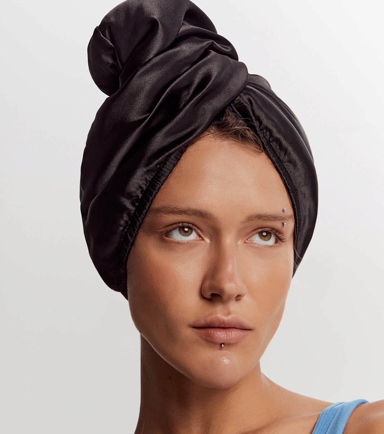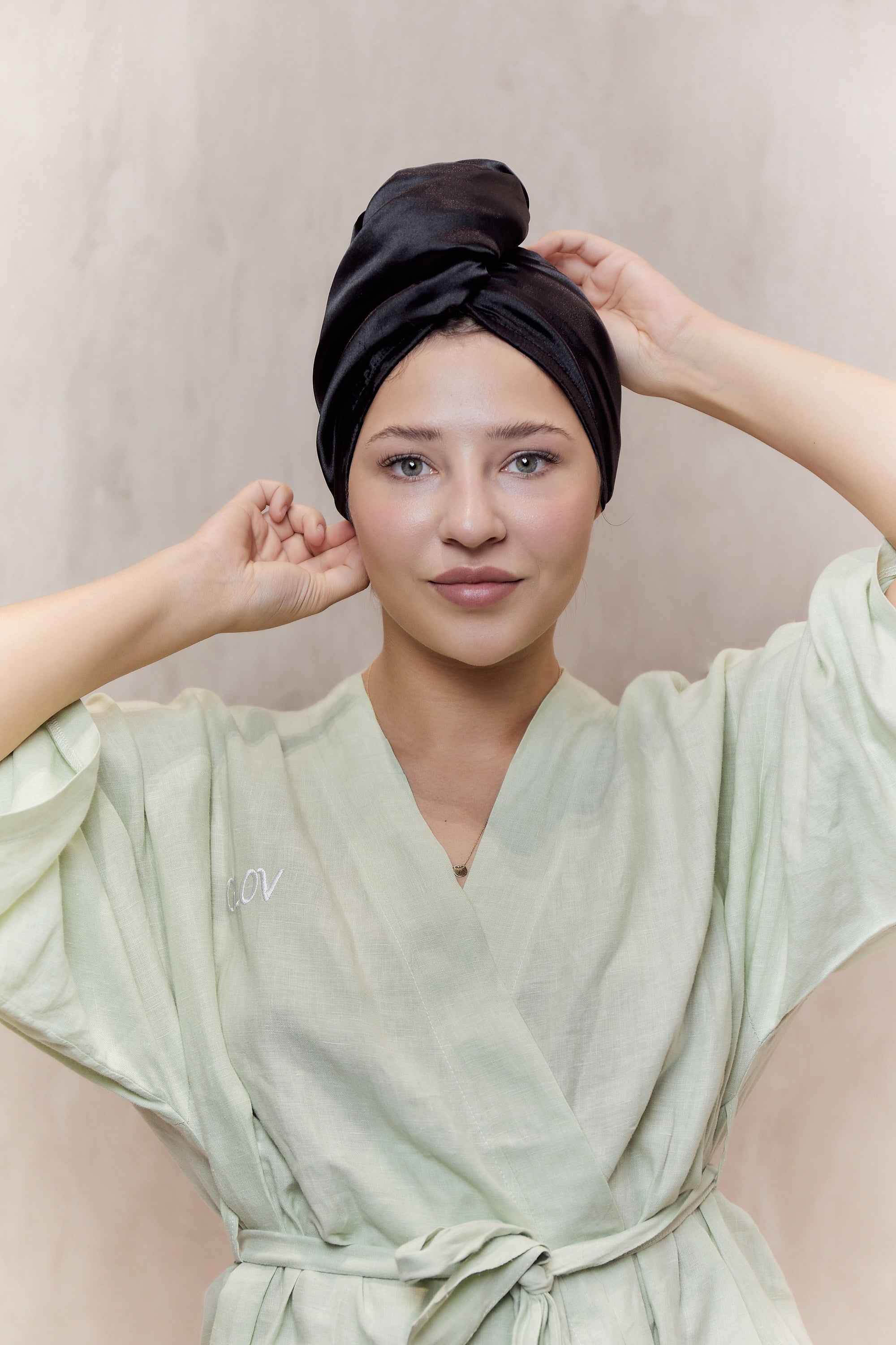 - Placez le turban de manière que le bouton se trouve à l'arrière de la tête. Enroulez ensuite le turban et attachez l'élastique au bouton pour maintenir les cheveux dans une position stable.